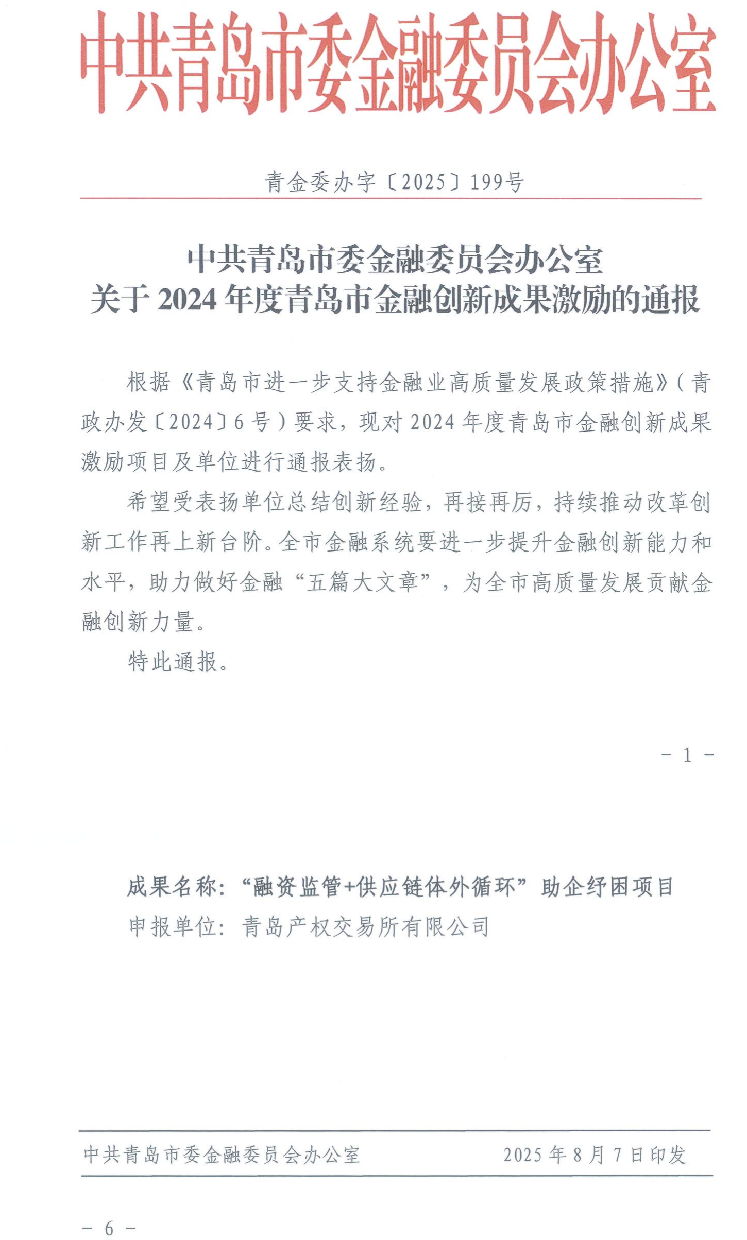 近日,2024年度青島市金融創(chuàng)新成果激勵(lì)評(píng)審工作落下帷幕,青島產(chǎn)權(quán)交易所有限公司申報(bào)的 “融資監(jiān)管+供應(yīng)鏈體外循環(huán)”助企紓困項(xiàng)目憑借突出的創(chuàng)新性、顯著的經(jīng)濟(jì)社會(huì)效益及重要的示范價(jià)值獲得優(yōu)秀獎(jiǎng)。