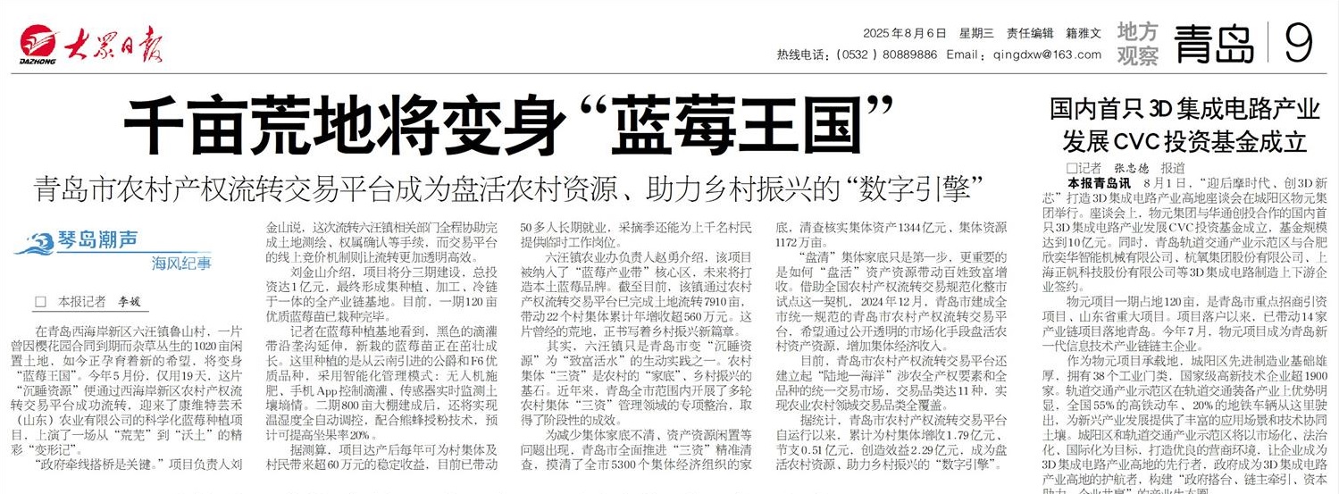 近日,青島日?qǐng)?bào)、大眾日?qǐng)?bào)、青島西海岸報(bào)等多家媒體報(bào)道青島市農(nóng)村產(chǎn)權(quán)流轉(zhuǎn)交易平臺(tái)在西海岸新區(qū)農(nóng)村集體資源招商引資、促進(jìn)鄉(xiāng)村振興中的關(guān)鍵作用。