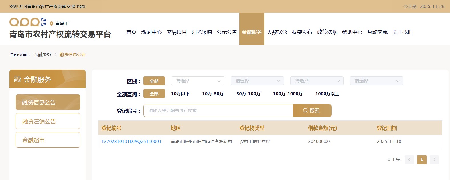 市農交平臺創(chuàng)新推出的農村產權融資信息公告服務,建立起規(guī)范的融資信息公示機制。這一服務通過公開展示融資信息,有效增強金融機構與借款人之間的互信,為雙方搭建安全、透明的合作渠道。金融機構可以通過注冊成為“金融機構”用戶,登錄查看抵押物詳細登記信息,有效防范重復抵押風險,為信貸決策提供可靠依據。中國郵政儲蓄銀行股份有限公司膠州市支行作為首批試點機構,已在市農交平臺成功發(fā)布首條融資信息公告,涉及借款金額304,000元。